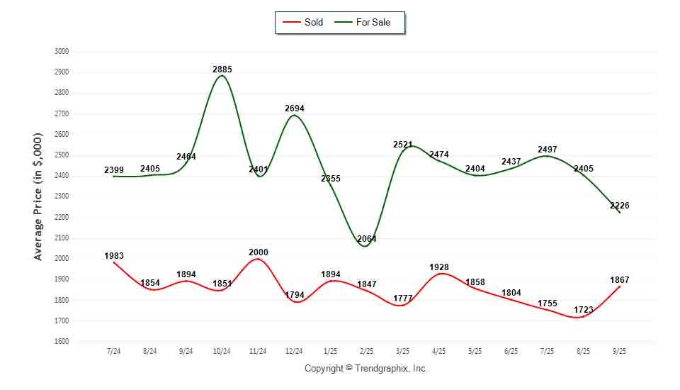The Average Sold Price in September was $1,867,000, down 1.4% from $1,894,000 in September of 2024 and up 8.4% from $1,723,000 last month.