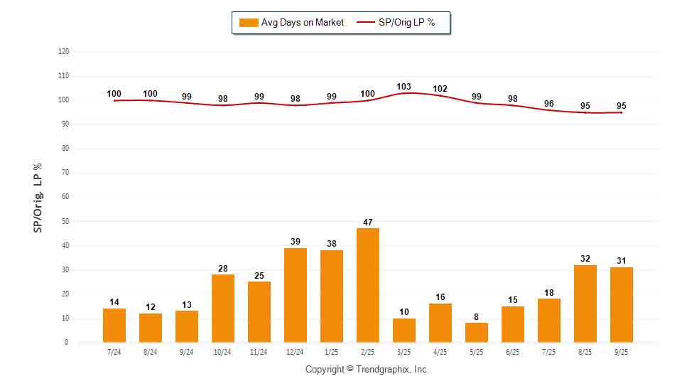 The average Days on Market (DOM) shows how many days the average property is on the market before it sells. An upward trend in DOM trends to indicate a move towards more of a Buyer’s market, a downward trend indicates a move towards more of a Seller’s market. The DOM for September 2025 was 31, down 3.1% from 32 days last month and up 138.5% from 13 days in September of last year.