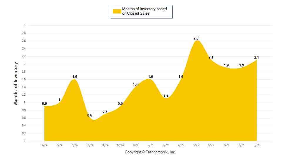 The September 2025 Months of Inventory based on Closed Sales of 2.1 was increased by 32% compared to last year and up 10.4% compared to last month. September 2025 was Seller's market.