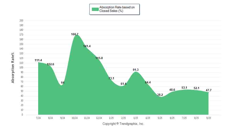 The September 2025 Absorption Rate based on Closed Sales of 47.7 was decreased by 25.5% compared to last year and down 8.5% compared to last month.
