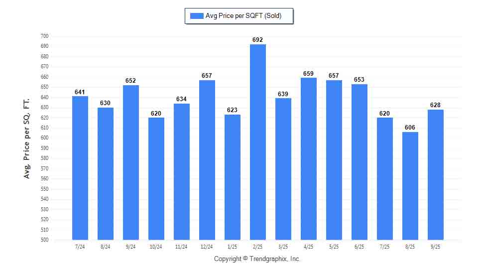 The Average Sold Price per Square Footage is a great indicator for the direction of property values. Since Median Sold Price and Average Sold Price can be impacted by the 'mix' of high or low end properties in the market, the Average Sold Price per Square Footage is a more normalized indicator on the direction of property values. The September 2025 Average Sold Price per Square Footage of $628 was up 3.6% from $606 last month and down 3.7% from $652 in September of last year.